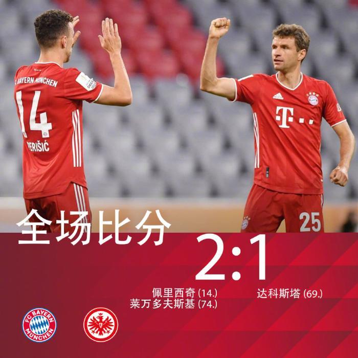 上半场比赛第5分钟,拜仁角球开出,穆勒前点头球后蹭,后卫在门前将球解围。第14分钟,阿拉巴送出长传,莱万大禁区前沿停球稍大,穆勒跟上直接一记挑传,佩里西奇禁区内无人盯防,他直接一个鱼跃头球攻破门将十指关,拜仁慕尼黑1:0法兰克福。