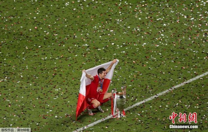 资料图:欧冠金靴莱万多夫斯基与欧冠奖杯合影。