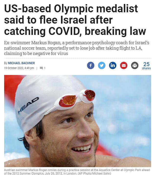 中新网10月21日电 据外媒报道,奥运会奖牌得主、奥地利游泳名将马库斯-罗根在新冠检测呈阳性后逃避了隔离,于上周偷偷离开以色列,回到了自己位于美国洛杉矶的家中。