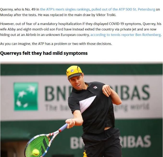 据外媒此前报道,曾在俄罗斯圣彼得堡参赛的美国网球球员山姆-奎里,在比赛前的一次检测中确认感染新冠病毒。然而本应隔离的他,却违反赛事和当地的防疫规定,私自联系一家私人飞机公司,包机飞离俄罗斯。