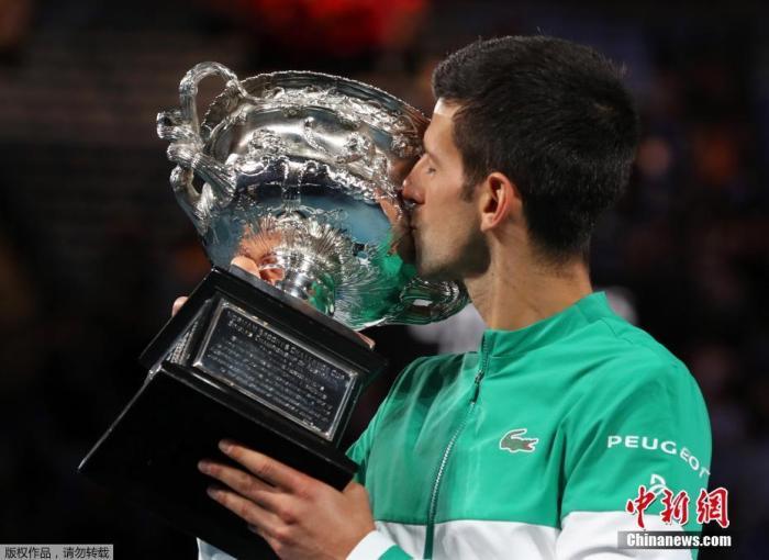 当地时间2月21日,2021年澳大利亚网球公开赛男单决赛中,世界排名第一的德约科维奇以7:5、6:2、6:2,大比分3:0击败梅德韦杰夫,生涯第9次捧起澳网冠军奖杯的同时,再一次刷新了由自己保持的澳网男单夺冠纪录。图为德约科维奇亲吻奖杯。