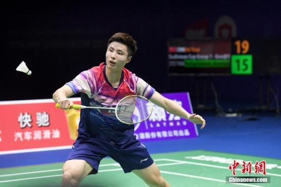 资料图:2019年5月25日,在广西南宁举行的苏迪曼杯世界羽毛球混合团体锦标赛半决赛中,中国队以3比0战胜泰国队,晋级决赛。图为中国队选手石宇奇在男子单打比赛中以2比0战胜泰国队选手坎塔蓬。中新社记者 俞靖 摄