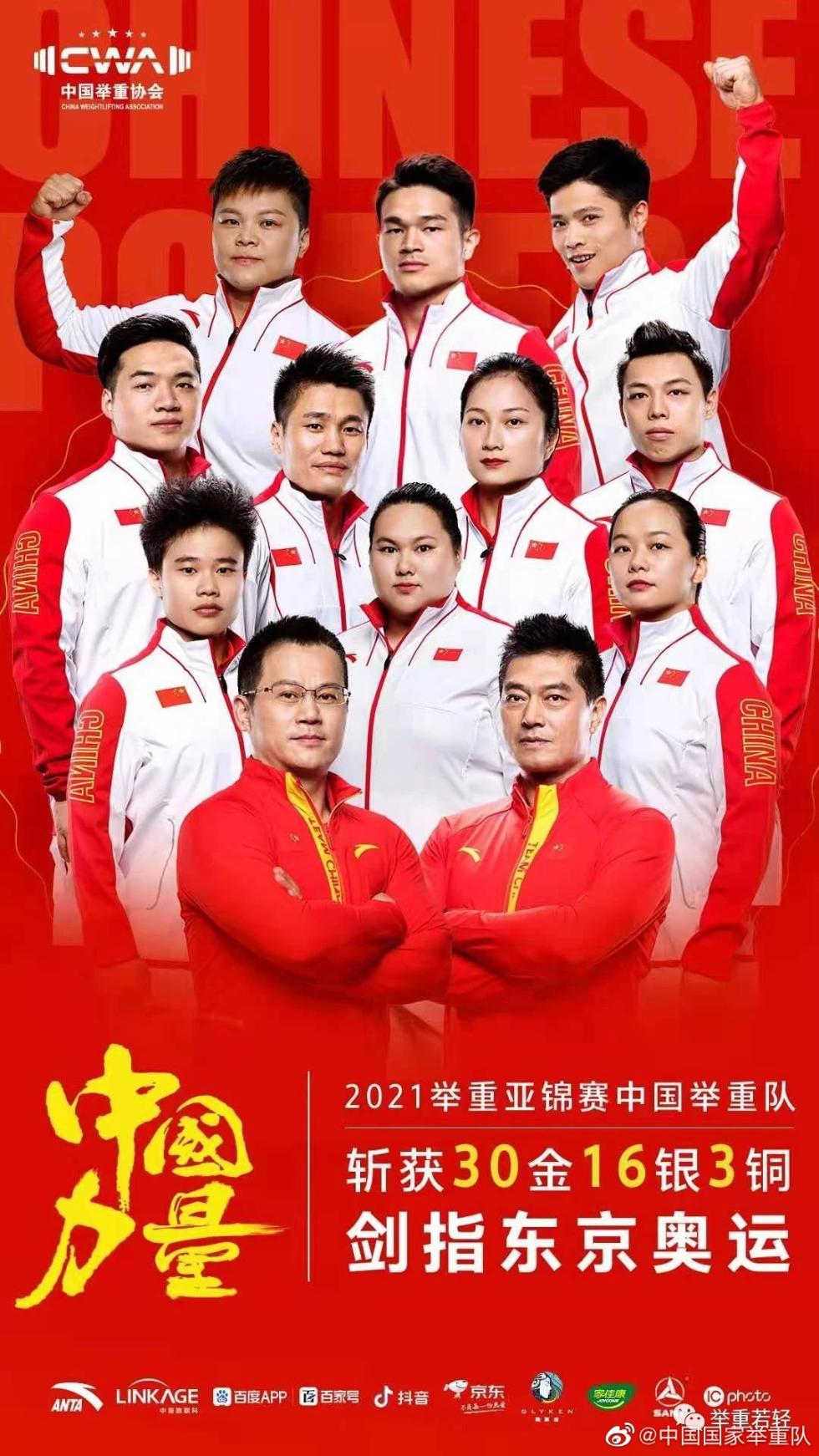 资料图:在4月份进行的举重亚锦赛上,中国举重队以30枚金牌的战绩收官,拿下10个总成绩冠军。图片来源:中国国家举重队官方微博