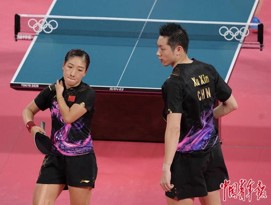 7月26日,中国选手许昕/刘诗雯以3:4爆冷不敌日本组合,无缘东京奥运会乒乓球混双冠军。中青报·中青网特派记者 刘占坤/摄