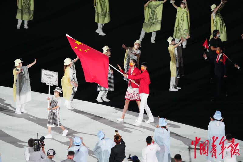 7月23日晚,日本东京新国立竞技场,东京奥运会开幕式上,中国奥运代表团步入会场,旗手是女子排球运动员朱婷和男子跆拳道运动员赵帅。中青报·中青网记者 刘占坤/摄