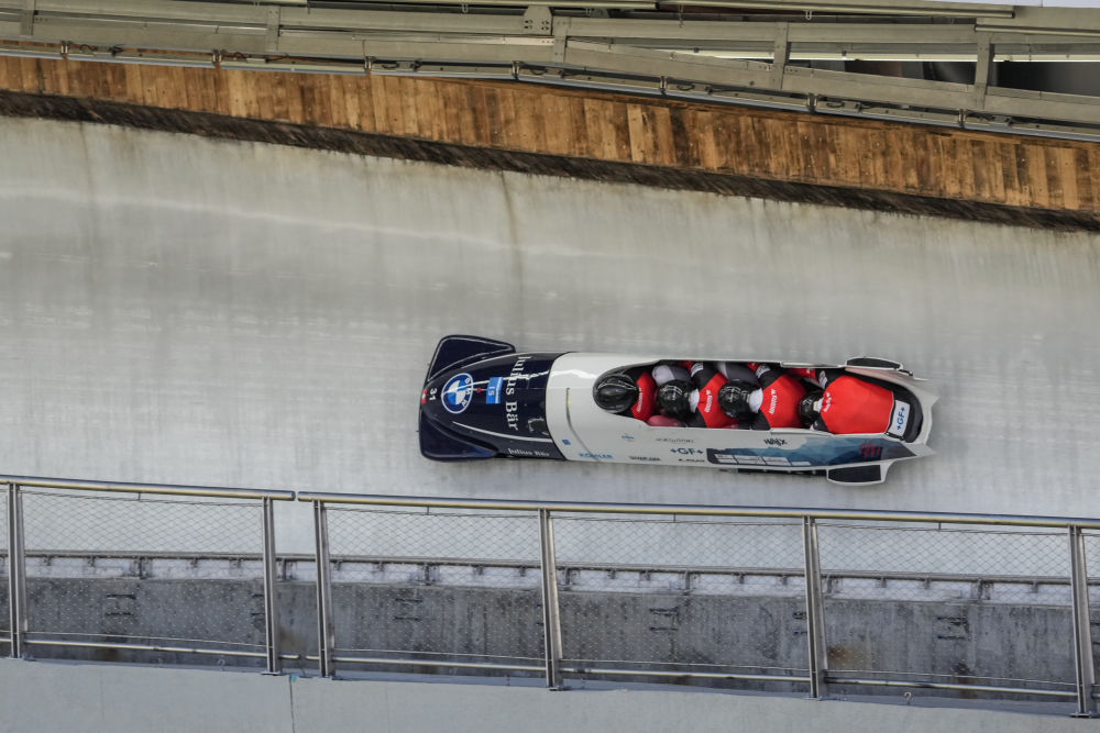 德国队选手弗朗西斯科弗里德里希、托尔斯滕马吉、康迪·鲍尔、亚历山大许勒尔在四人雪车比赛中。新华社记者 贺长山 摄
