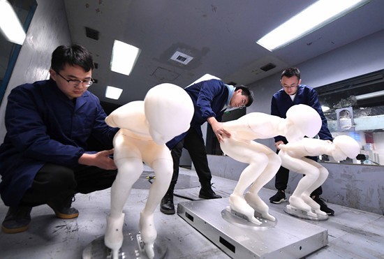2021年11月30日,北京,为了完成部分测试项目,实验室专门通过3D打印的方法制作了三个运动员模型,北交大的同学们正把测试用模型安置在风洞中准备进行实验。视觉中国供图