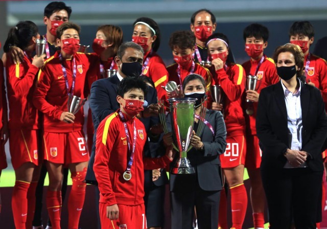 2月6日,中国队球员王珊珊(前左)在2022女足亚洲杯决赛的颁奖仪式上接过奖杯。新华社发(贾韦德·达尔摄)