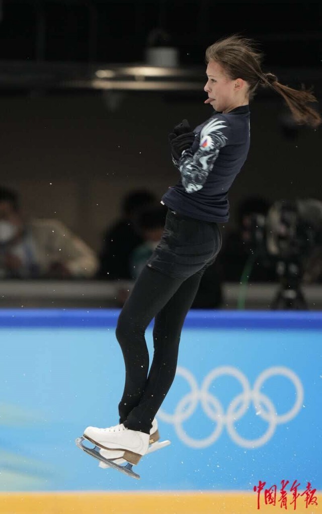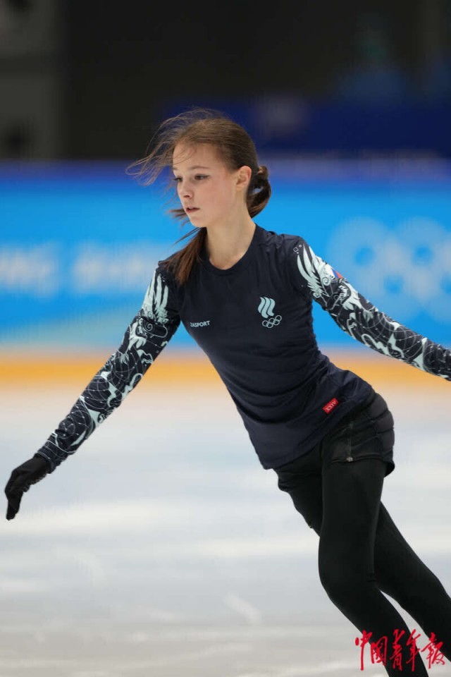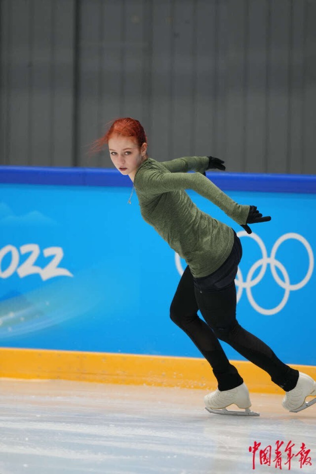 2月9日,北京首都体育馆,俄罗斯花样滑冰选手安娜·谢尔巴科娃在训练中。2004年出生的她被中国冰迷亲切地称为“千金”,目前国际滑联排名世界第一。中青报·中青网记者 李隽辉/摄