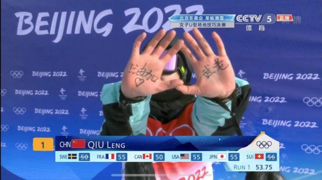 刚刚,在单板滑雪女子U型场地技巧决赛第一轮中,率先出场的中国队选手邱冷完成动作后,对着镜头亮出双手手掌,邱冷手掌上写着老武加油。昨天的资格赛,她的队友武邵桐遗憾未能晋级。邱冷用这样的方式表达自己与队友的团结友爱。加油,姑娘们!