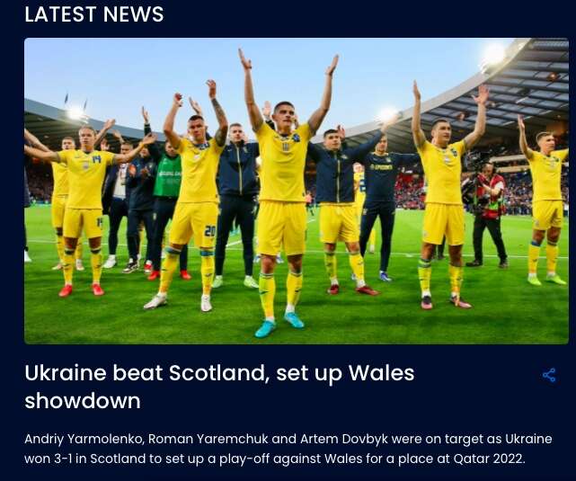 中国青年报客户端北京6月2日电(中青报·中青网记者郭剑)北京时间今晨结束的一场2022卡塔尔世界杯欧洲区附加赛,乌克兰队在客场3:1取胜信心十足的苏格兰队。按照附加赛赛程,乌克兰队将于北京时间6月6日凌晨在威尔士首府卡迪夫挑战威尔士队,这场比赛胜者将赢得卡塔尔世界杯决赛圈门票,进入英格兰、伊朗、美国所在的B组。