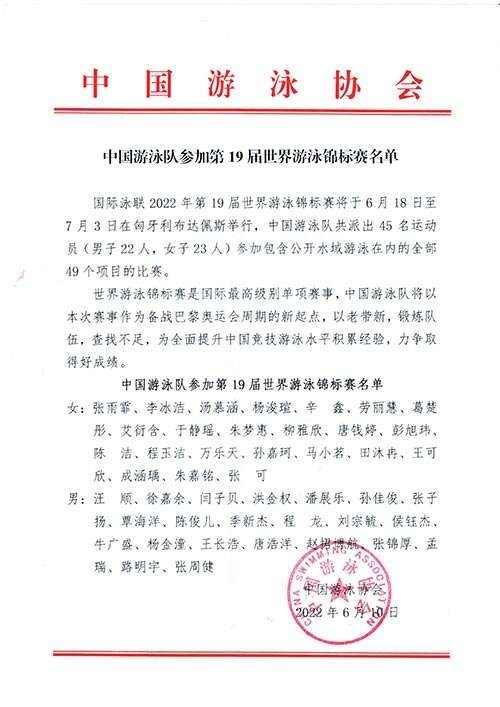 中国青年报客户端北京6月10日电(中青报·中青网记者慈鑫)中国游泳协会今天公布了即将参加2022游泳世锦赛的中国游泳队名单。中国游泳队共派出45人参赛,包括男运动员22人、女运动员23人,由奥运冠军汪顺、张雨霏领衔。