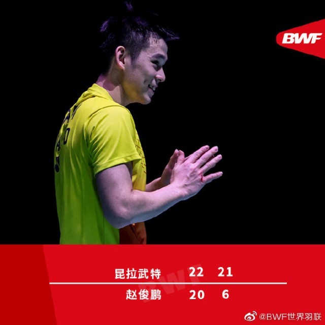 本场比赛,被誉为泰国羽毛球“天才少年”的昆拉武特,比赵俊鹏的世界排名高出了6位。双方在首局便开始纠缠。赵俊鹏凭借不断的前后调动在局中保持着1-2分的领先。局末,赵俊鹏的失误开始增多,加之对手昆拉武特打出一记运气球,赵俊鹏以20:22落败。