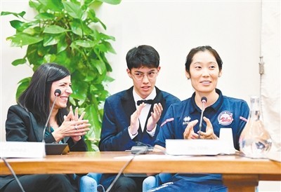 10月18日,朱婷(右)在发布会上。当日,意大利斯坎迪奇俱乐部在佛罗伦萨召开新闻发布会,宣布中国女排名将朱婷加盟,并签订了为期一个赛季的合约。 新华社记者 金马梦妮 摄