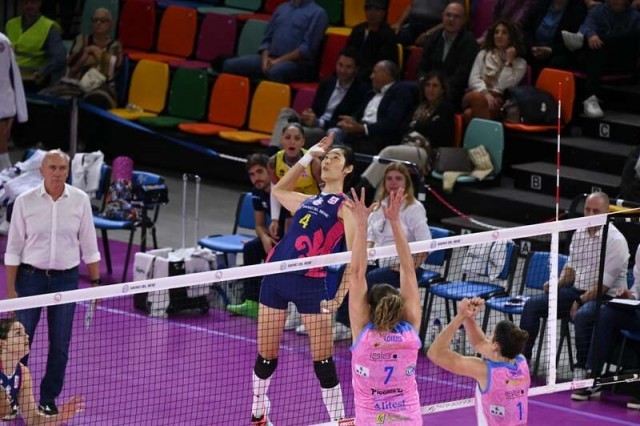 朱婷在比赛中扣球。图片来源:意大利女排联赛官方网站