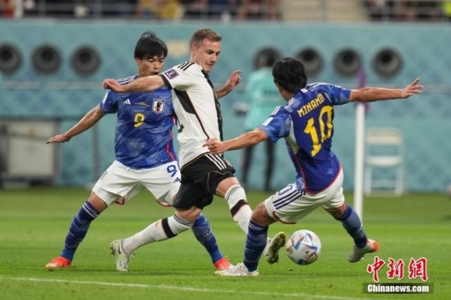 资料图:当地时间11月23日,世界杯小组赛E组首轮第一场,德国队对阵日本队的比赛打响,“死亡小组”E组小组赛的捉对“厮杀”正式开始。本场比赛,日本队在上半场落后一球的情况下,下半场后半段持续威胁德国队球门,由堂安律扳平比分,浅野拓磨打入致胜球,最终逆转德国取胜。图为比赛现场。中新社记者 崔楠 摄