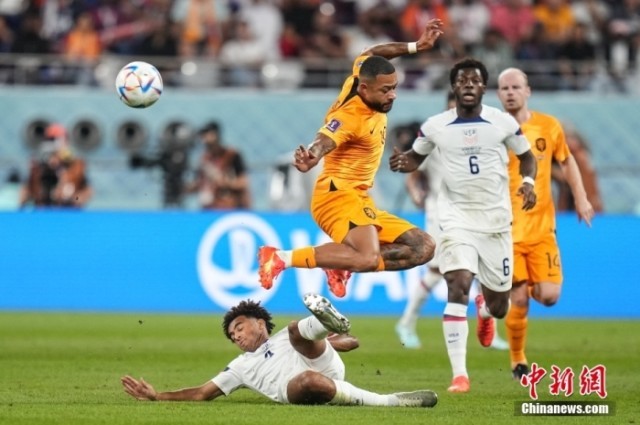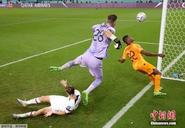 北京时间12月3日,卡塔尔世界杯八分之一决赛,荷兰队对阵美国队。最终,荷兰队3:1战胜美国队,率先闯入八强。图为美国队进球瞬间。中新社记者 崔楠 摄