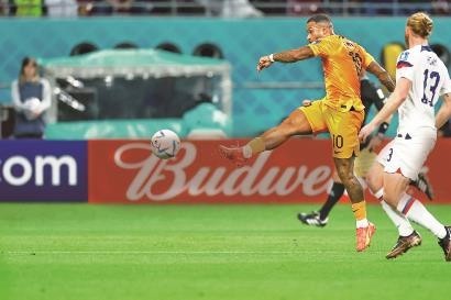 美国队平均年龄25岁84天,是本届世界杯淘汰赛队伍中队龄最小的。此前三场小组赛不败,也追平球队征战世界杯的不败纪录。开场,年轻的美国队很快展现强悍一面,普利西奇禁区内的射门眼看要蹿入球网,却被身高超过2米的荷兰门将诺帕特伸腿挡出。但顶住美国队的攻击后,利用一个反击,荷兰队首次射门就打破僵局。接到邓弗里斯右肋倒三角传中,德佩禁区弧一脚低射打入远角。这是德佩在国家队攻入的第43球,总射手榜上,仅次于范佩西。进球后,他把双手插入耳朵完成标志性的庆祝,看台上,荷兰球迷连忙呼应,也作出同样的庆祝动作。