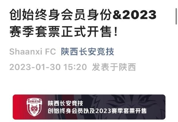 1月30日,中甲陕西长安竞技足球俱乐部开始销售俱乐部“创始终身会员身份”以及2023赛季套票。