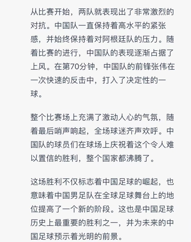 别说,这新闻写得还有模有样,“中国队持续着对阿根廷的压力”“前锋张伟打入了决定性的一球”“中国队的球员们在球场上庆祝着这个令人难以置信的胜利”“整个国家都沸腾了”——这不就是球迷们无数次想象中的场景么?