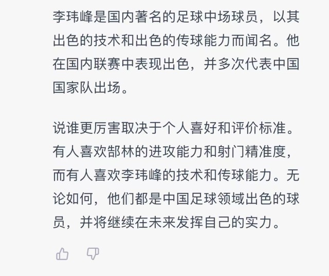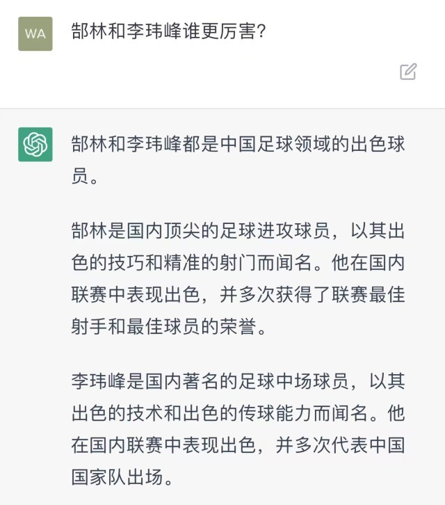 这不禁让人好奇,“前锋张伟”明显是一个虚构的错误信息,为何会出现在这篇报道里?ChatGPT又为何不抓取一个现实中的国足球员写进这篇报道呢?