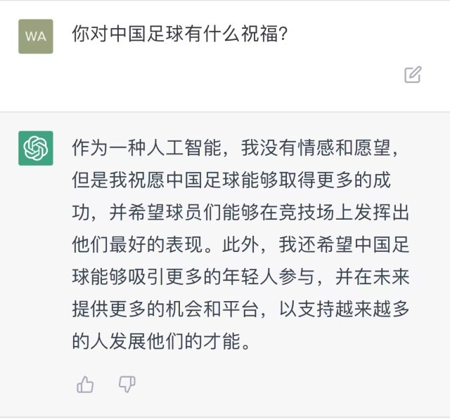 最后,我决定以一个比较温情的问题结束这场互相为难的对话,尽管ChatGPT说它并没有情感和愿望,但还是祝福中国足球能够取得成功。