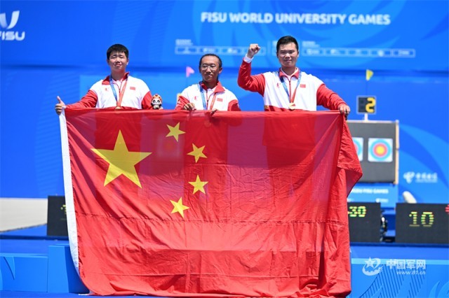成都成就梦想!在7月30日结束的男子复合弓团体金牌赛中,中国队以231环比224环战胜法国队,为中国射箭队创纪录地斩获一枚宝贵的金牌。