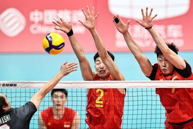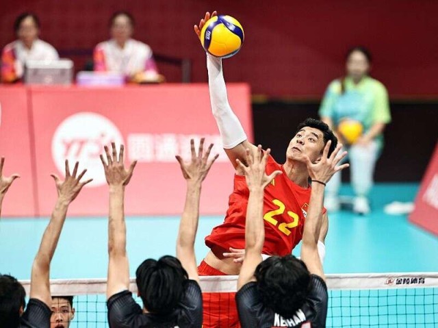 中国男排在9月25日晚亚运会男排半决赛中,干脆利落地以3:0战胜日本男排,3局比分为25:15、25:20、25:21,此前结束的另一场半决赛伊朗男排同样以3:0战胜卡塔尔队,中国男排将与伊朗队在26日晚举行的决赛中争夺金牌。(中青报·中青网记者 郭剑文 视觉中国供图)
