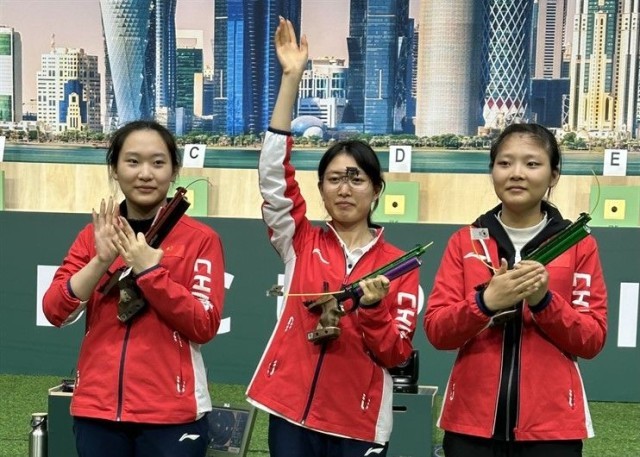 新华社多哈11月21日电 2023年国际射联射击世界杯总决赛21日在卡塔尔多哈拉开战幕,在女子10米气手枪项目中,中国队的李雪、赵楠和姜冉馨发挥出色,包揽该项目前三名。