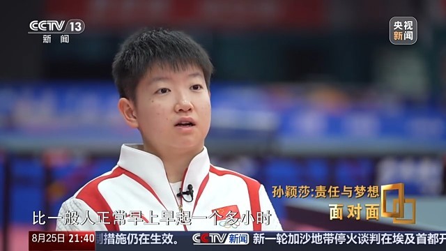 孙颖莎:就是奥林匹克精神,更快更高更强,你不断去超越自己,然后成为一个榜样,然后树在这,可能会传递给以后的年轻运动员,他可能说想成为像孙颖莎一样的人。不管成绩如何,我觉得做到自己问心无愧,其实就很好。