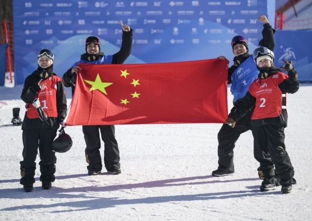 2月10日,中国选手张小楠、杨文龙、姜鑫杰与熊诗芮(从左至右)在比赛后庆祝。当日,在亚布力举行的第九届亚冬会单板滑雪女子大跳台决赛中,中国选手熊诗芮夺冠,张小楠获得亚军;在男子大跳台决赛中,中国选手杨文龙夺冠,姜鑫杰获得亚军。新华社记者 牟宇 摄