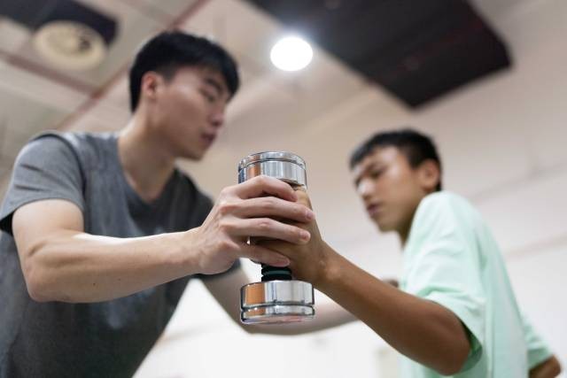 在结束早午两操后,助教林琪深单独留下钟英杰,帮助他用哑铃加练手臂伸展力量。