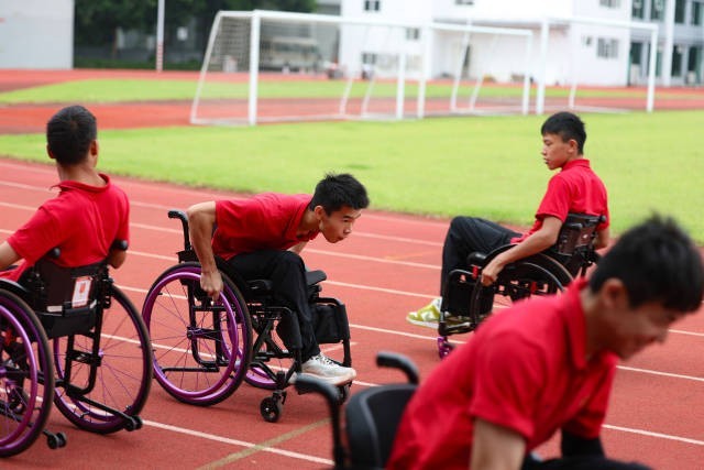 早上,队员们在操场刷圈,轮椅在跑道上向前转动,一圈又一圈。转入训练馆,队员们换上厚重的训练服,反复练习出击、躲闪等动作,汗水顺着脸颊不断滑落。