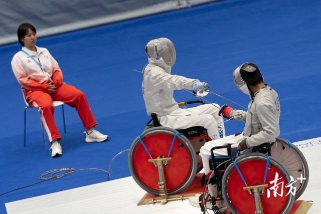 10日,轮椅击剑项目女子个人重剑C级金牌战打响。虽然是一场“广东德比”之战,广东省轮椅击剑队教练龙杰还是静静站在赛场边,盯着队员们的每一个动作。