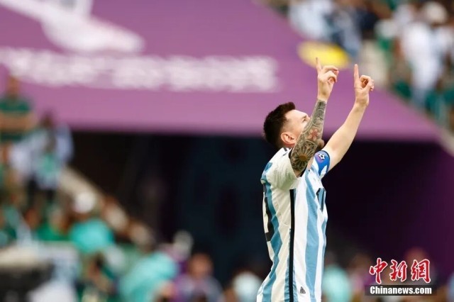 梅西在卡塔尔世界杯上进球后,双手指天庆祝。中新社记者 富田 摄