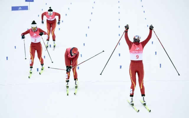 ↑2月12日,中国队选手王强(中)在第九届亚冬会越野滑雪男子4x7.5公里接力决赛中。最终,中国队获得冠军。新华社记者 伍志尊 摄
