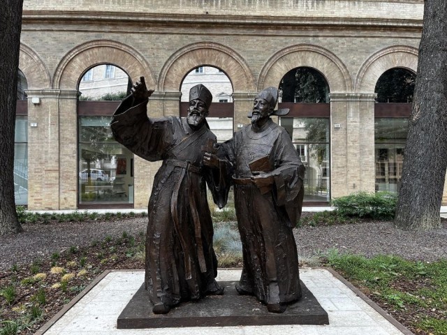 在意大利小城马切拉塔拍摄的以利玛窦与中国明代科学家徐光启为原型的雕塑《利徐谈道》。