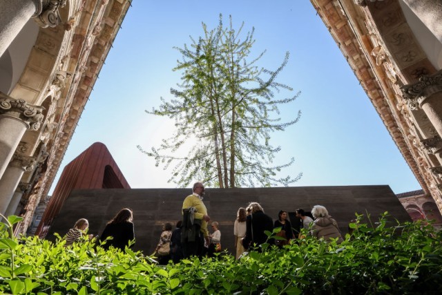 2025年4月11日,在意大利米兰国立大学,人们参观中国设计师吴滨的设计作品《杳然庭》。