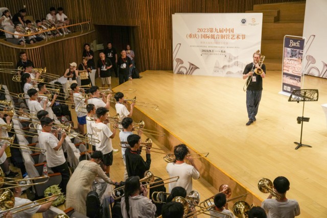 2023年8月1日,在重庆举办的第九届中国国际低音铜管艺术节的一场公益大师课上,来自意大利的长号艺术家彼得·斯坦纳在指导爱好者练习长号。