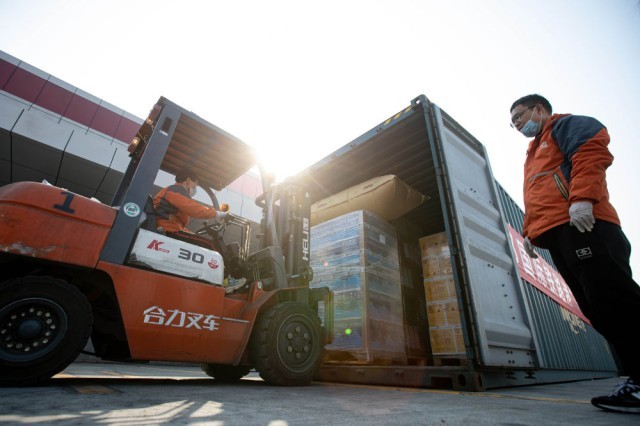 2021年2月1日,在成都国际铁路港,工作人员在搬运货物。当日,一列满载意大利红酒、饼干等食品的中欧班列抵达成都国际铁路港,为川渝两地群众带来了丰富的“洋年货”。