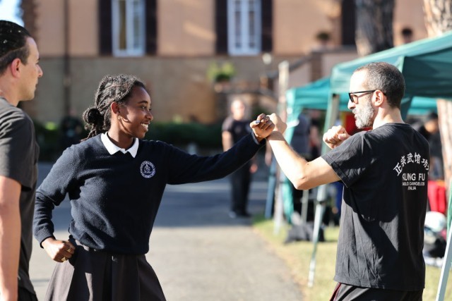2025年10月10日,在意大利罗马,学生在中秋主题游园会上体验中国功夫。武术、拓印、投壶、包饺子等多个游园项目吸引了众多学生和家长参与体验。
