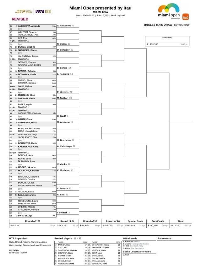 今天(17日),WTA1000迈阿密站最新签表公布,前八种子对位如下:
