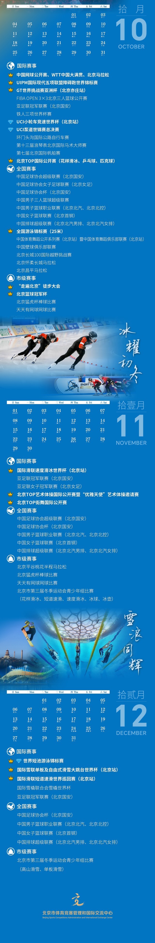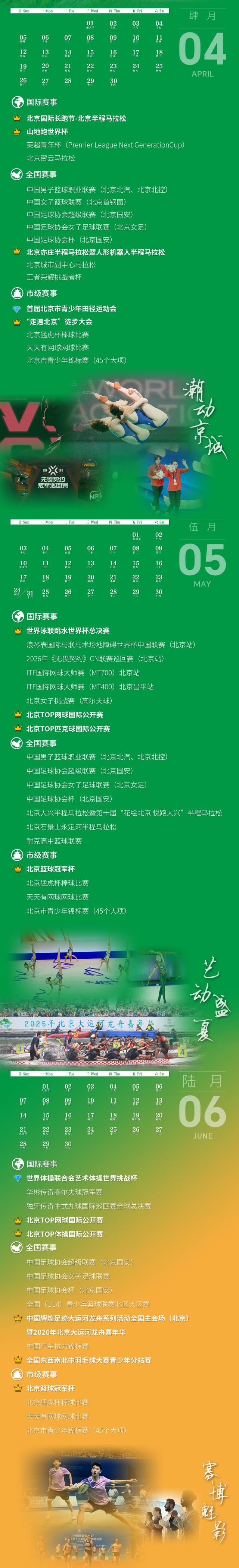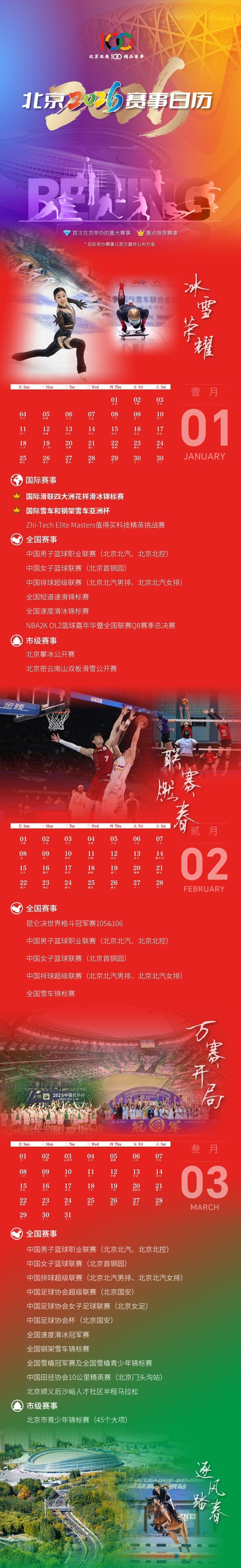 2026北京赛事日历按照各类比赛的特点延续“开年季、潮动季、燃情季、冰雪季”的季度主题,并进一步细化为12个月度主题。赛事日历中,每月赛事按照国际、全国、市级三类细致呈现,还特别用“皇冠”“钻石”等标识注明重点推荐赛事和首次在京举办赛事,帮助广大的体育爱好者更直观地了解赛事情况。