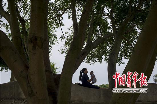 日前,江西省赣州市于都县,于都河“长征第一渡口”旁,一位母亲带着孩子在树荫下玩耍。1934年10月16日至19日,8.6万余名红军告别父老乡亲,夜渡于都河跨出了长征的第一步。中国青年报·中青在线 李隽辉/摄