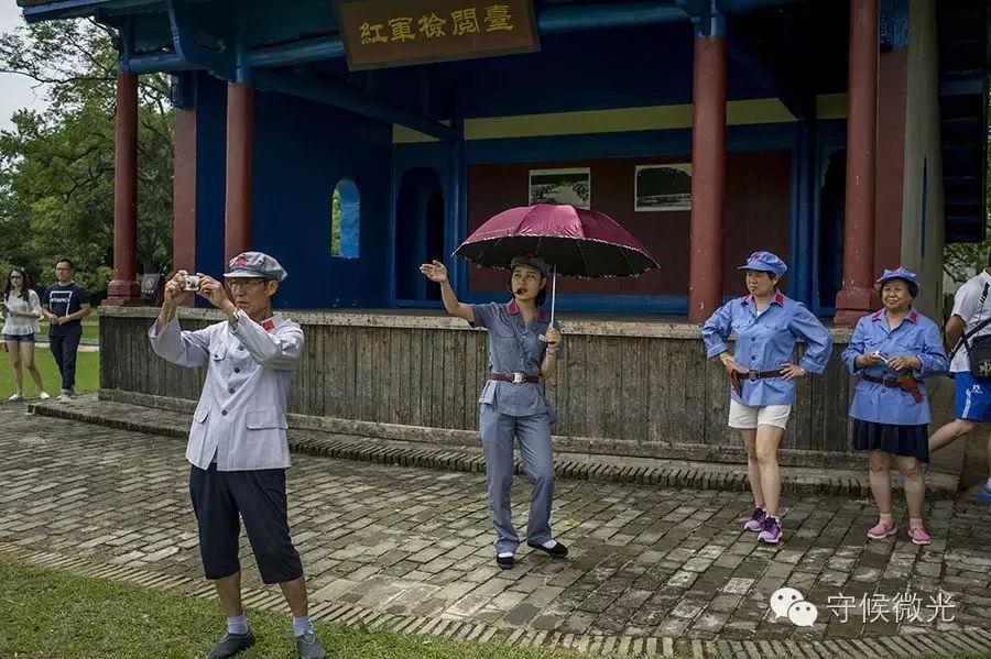 8月28日中午,江西瑞金叶坪乡革命旧址群,从张家口远道而来的67岁的李洪利(前左一)和老伴王海风(右一)身着红军服装在红军检阅台前参观。李洪利曾经当过五年兵,这次来参观叶坪乡革命旧址群也圆了他的红军梦。李隽辉/摄