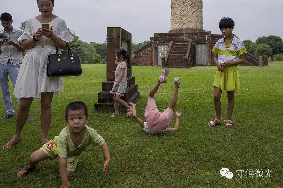 8月28日,江西瑞金叶坪,革命旧址群,孩子们在红军烈士纪念塔前的草坪嬉戏。李隽辉/摄