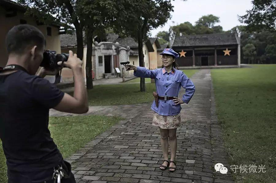 8月28日,江西瑞金叶坪,“一苏大”旧址前,一位参观者穿上红军服拍照留影。赵青/摄