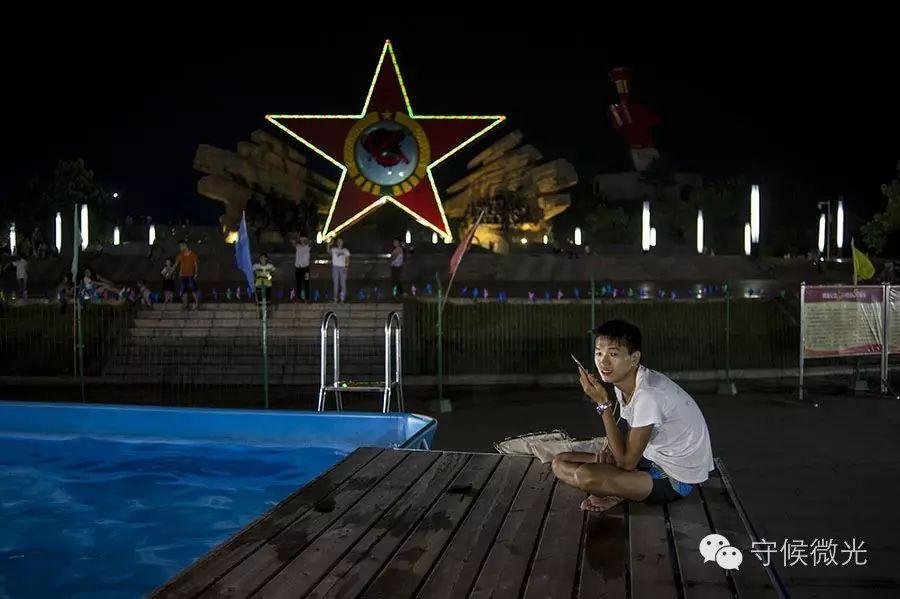 8月28日,江西瑞金,中华苏维埃纪念园内红五星欢乐水世界,负责泳池的救生员坐在角落里和朋友微信聊天。李隽辉/摄