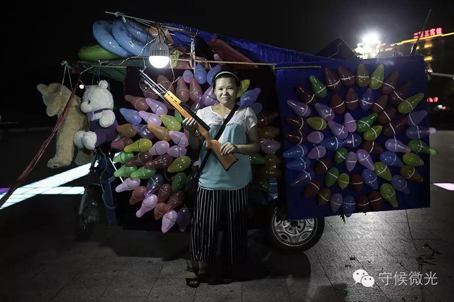 8月27日晚,江西瑞金中央革命根据地纪念馆下,一位夜市摆摊的女摊主举起气球枪拍照。赵青/摄