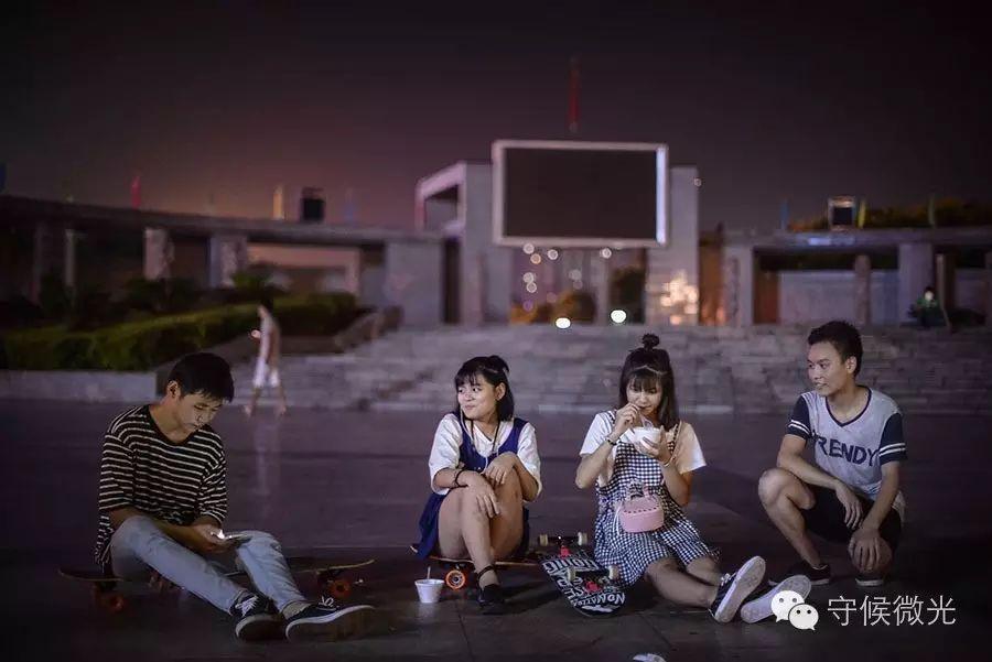 8月26日晚,江西于都,长征广场中央,17岁的邹丹(右二)和她的朋友们在练习滑板间隙吃宵夜、聊天。王婷舒/摄